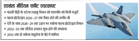 - पांचवीं पीढ़ी के स्टील्थ लड़ाकू विमान को एएमसीए को मिली मंजूरी