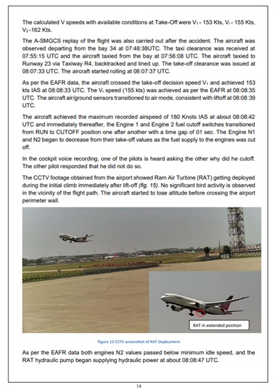 - जब इंजनों की शक्ति कम हुई, तो आपातकालीन हाइड्रोलिक शक्ति प्रदान करने के लिए रैम एअर टर्बाइन - एक छोटा प्रोपेलर जैसा उपकरण - स्वचालित रूप से चालू हो गया। AAIB द्वारा प्राप्त सीसीटीवी फुटेज में RAT को चालू होते हुए दिखाया गया है। (विमान हादसे के बाद जांच में)