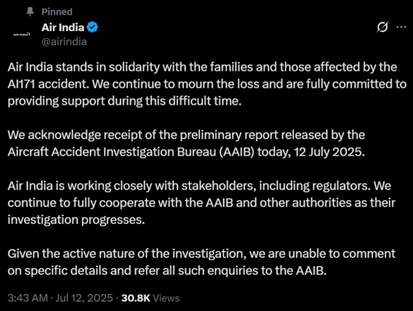 एअरलाइन ने एक्स पर एक पोस्ट में कहा कि हमें विमान दुर्घटना जांच ब्यूरो द्वारा आज, 12 जुलाई 2025 को जारी की गई प्रारंभिक रिपोर्ट प्राप्त होने की सूचना मिली है। इसके अलावा, एअरलाइन ने कहा कि वह नियामकों सहित हितधारकों के साथ मिलकर काम कर रही है। हम एएआईबी और अन्य अधिकारियों के साथ उनकी जांच की प्रगति के साथ पूर्ण सहयोग करना जारी रखेंगे।