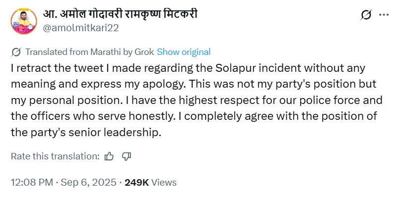 यह मेरी पार्टी की मांग नहीं थी। मेरा निजी नजरिया था। मैं उन सभी पुलिस फोर्स और अधिकारियों का सम्मान करता हूं, जो ईमानदारी से अपनी सेवा दे रहे हैं। मैं पार्टी के फैसले से पूरी तरह सहमत हूं। सोलापुर मामले से जुड़ी मैं अपनी पोस्ट डिलीट करते हुए माफी मांगता हूं।