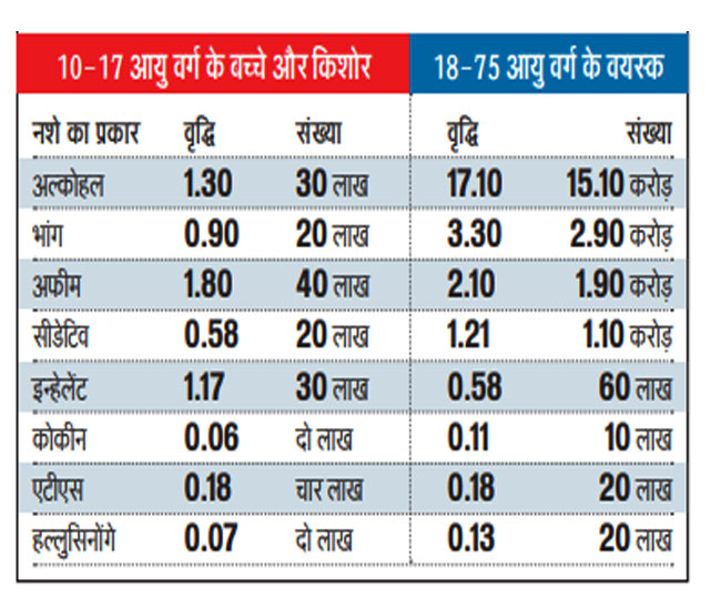 इस रिपोर्ट में 18 से 75 आयु वर्ग के लोगों के आंकड़ों के बारे में भी बताया गया है। रिपोर्ट के मुताबिक, 15.1 करोड़ वयस्क अल्कोहल का प्रयोग करते हैं और इनमें 17.10 फीसद की दर से वृद्धि दर्ज की गई है। वहीं, 2.9 करोड़ वयस्क भांग का इस्तेमाल करते हैं और इनमें 3.30 फीसद की दर से वृद्धि देखी गई है। अफीम की बात की जाए तो 1.9 करोड़ वयस्क इसे लेते हैं और इनमें वृद्धि 2.1 फीसद की दर से देखी गई है। सीडेटिव का प्रयोग 1.1 करोड़ लोग और इन्हेलेंट का 60 लाख करते हैं।