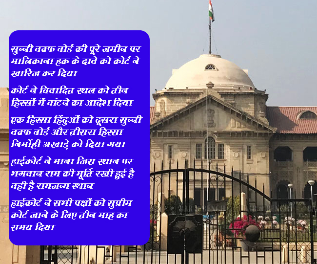 राम चबूतरा और सीता रसोई निर्मोही अखाड़े को सौंपी गई थी। पूरी जमीन का एक तिहाई भूभाग उन्हें सौंपने का आदेश दिया गया था। हाईकोर्ट ने अपने आदेश में उन दलीलों को खारिज कर दिया जिसमें कहा गया था कि जब 1949 में वहां पर मूर्तियां रखी गई तब उन्होंने मामला दायर नहीं किया था। लिहाजा कोर्ट ने जमीन के एक तिहाई हिस्से पर सुन्नी वक्फ बोर्ड का अधिकार दिया गया था।
