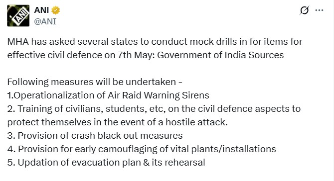 दरअसल, समाचार एजेंसी ने भारत सरकार के सूत्रों के हवाले से बताया कि गृह मंत्रालय ने कई राज्यों से 7 मई को प्रभावी नागरिक सुरक्षा के लिए मॉक ड्रिल करने को कहा है।
