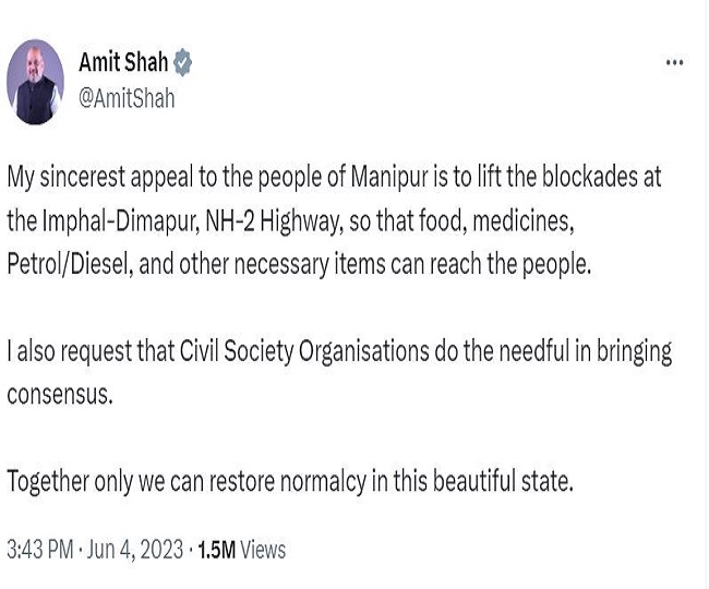लोगों से सड़क नाकाबंदी वापस लेने का आग्रह करते हुए, शाह ने ट्वीट किया, 'मणिपुर के लोगों से मेरी ईमानदारी से अपील है कि इंफाल-दीमापुर, एनएच-2 राजमार्ग पर अवरोधों को हटा दें, ताकि भोजन, दवाएं, पेट्रोल, डीजल और अन्य आवश्यक चीजें लोगों तक पहुंच सकें।'