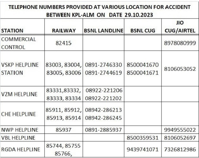 रेलवे के जनसंपर्क अधिकारी ने बताया कि आंध्र प्रदेश में हुई ट्रेन दुर्घटना के बाद राहत एवं बचाव कार्य जारी है। रेलवे के कई अधिकारी मौके पर पहुंच गए हैं। रेल मंत्री अश्विनी वैष्णव ने बताया कि पटरी से उतरे और प्रभावित डिब्बों के अलावा सभी को घटनास्थल से हटा दिया गया है।