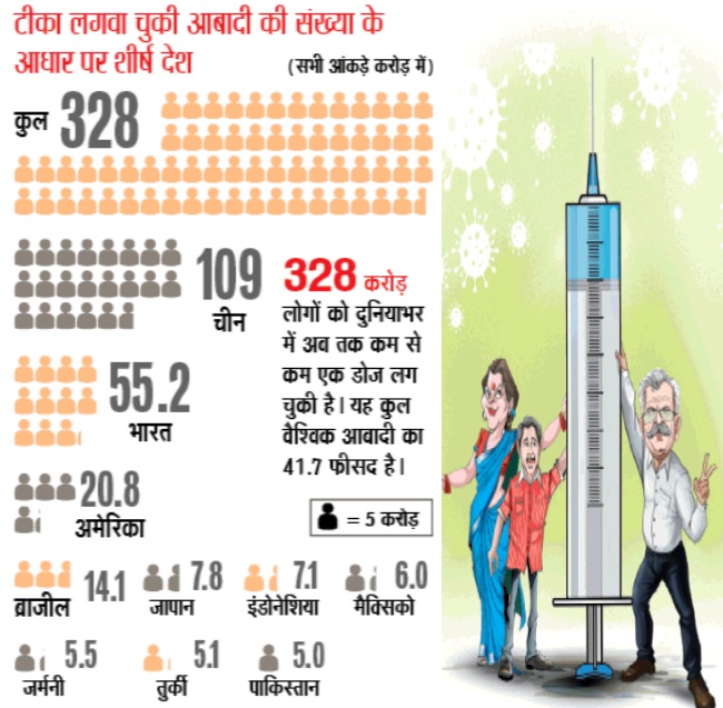 आबादी के प्रतिशत के आधार पर टीकाकरण में अव्वल देश संयुक्त अरब अमीरात है तो आबादी की संख्या के आधार पर भारत दूसरे स्थान पर है। 328 करोड़ लोगों को दुनियाभर में अब तक कम से कम एक डोज लग चुकी है। यह कुल वैश्विक आबादी का 41.7 फीसद है।