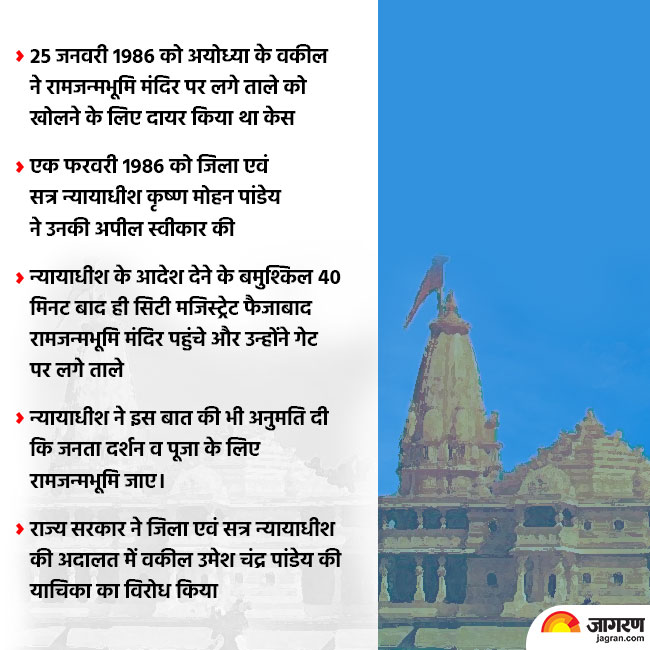 1986 में ही मुकदमे की सुनवाई पूरी हुई और जज ने कहा कि वह मुकदमे का फैसला उसी दिन शाम 4.15 बजे करेंगे। शाम 4.15 बजे उन्होंने ताला खोलने का आदेश दे दिया। इस आदेश में न्यायाधीश ने यह अनुमति भी दे दी थी कि दर्शन व पूजा के लिए लोग रामजन्मभूमि जा सकते है। अयोध्या में इस जगह को लेकर हिंदू-मुस्लिम समुदाय अपने-अपने दावे तो अरसे से कर रहे थे लेकिन इस चिंगारी को हवा फैजाबाद के जिला एवं सत्र न्यायाधीश के एक आदेश के बाद ही लगी थी।