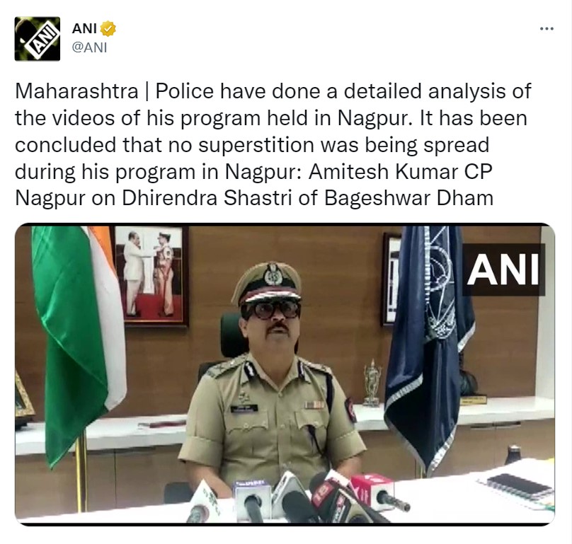 नागपुर पुलिस ने अपनी रिपोर्ट में जानकारी दी कि वीडियो में देखने पर इसमें स्पष्ट हुआ है कि इसमें धर्म के प्रचार से जुड़ी सामग्री नहीं है। वहीं, इसमें अंधश्रद्धा जौसी कोई चीज नजर नहीं आ रही है। दरअसल, धीरेंद्र कृष्ण शास्त्री लोगों की समस्याओं को उससे बिना पूछे कागज पर लिख देते हैं और बिना बताए ही लोगों के मन की बात भी जान लेते हैं। यह दावा लाखों की संख्या में मौजूद धीरेन्द्रकृष्ण शास्त्री के भक्त करते आए हैं।