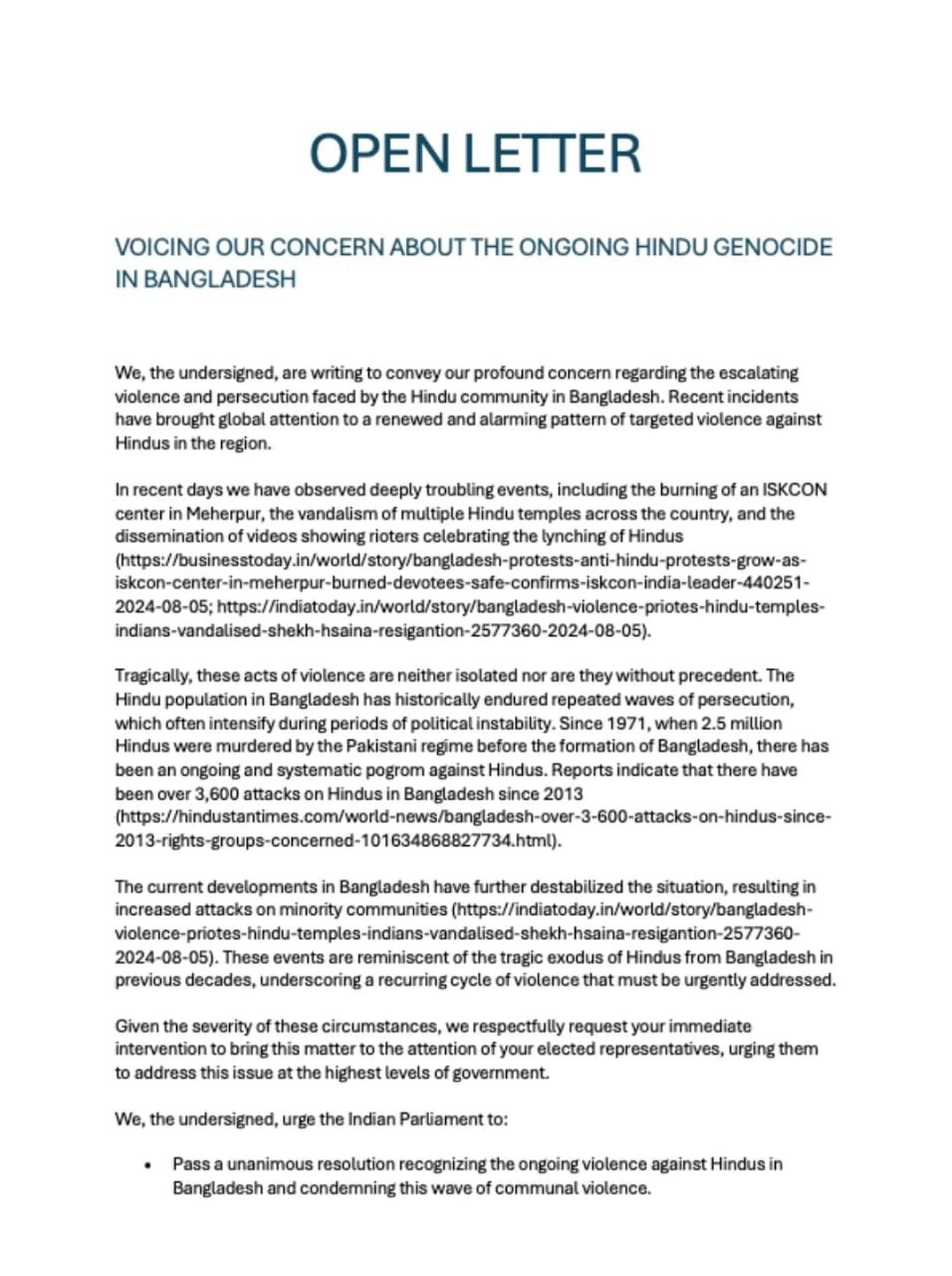 पत्र में यह भी कहा गया है कि हस्ताक्षरकर्ता सभी लोगों ने बांग्लादेश में हिंदू समुदाय द्वारा सामना की जा रही बढ़ती हिंसा और उत्पीड़न के बारे में अपनी गहरी चिंता व्यक्त करने के लिए ये पत्र लिखा है। हाल की घटनाओं ने इस क्षेत्र में हिंदुओं के खिलाफ लक्षित हिंसा के एक नए और खतरनाक पैटर्न की ओर वैश्विक ध्यान आकर्षित किया है।