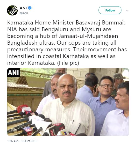 नई दिल्ली,एएनआइ। कर्नाटक के गृह मंत्री बसवराज बोम्मई ने कहा कि एनआइए ने कहा है कि बैंगलुरू और मैसूर जमात-उल-मुजाहिदीन बांग्लादेश का केंद्र बन गया है। उन्होंने कहा कि हमारी पुलिस इसके लिए सभी एतिहात कदम उठा रही है। तटीय कर्नाटक के साथ-साथ आंतरिक कर्नाटक में भी उनका आंदोलन तेज हो गया है।