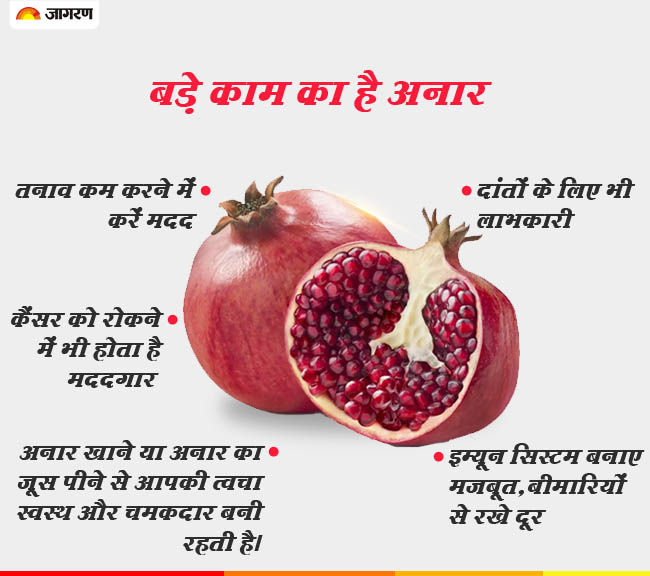 नई दिल्ली [जागरण स्पेशल]। दुनिया में अगर आम को फलों का राजा माना जाता है। तो अनार को भी कम नहीं आंका जा सकता है। सभी जानते हैं कि अनार खाना स्वास्थ्य के लिए बहुत अच्छा होता है। खास बात ये भी है कि इसका स्वाद भी काफी अच्छा होता है। यही वजह है कि बच्चे से लेकर बुजुर्ग सभी इसे आराम से खा लेते हैं। ये फाइबर, विटामिन सी और के का एक अच्छा माध्यम है। इसमें मौजूद एंटी-ऑक्सीडेंट्स के शरीर के लिए काफी लाभ हैं। अनार में प्रचुर मात्रा में लाभदायक प्रोटीन, कार्बोहाइड्रेट, फाइबर, विटामिन और खनिज पाए जाते हैं। आइए जानें अनार के क्या लाभ हैं:
