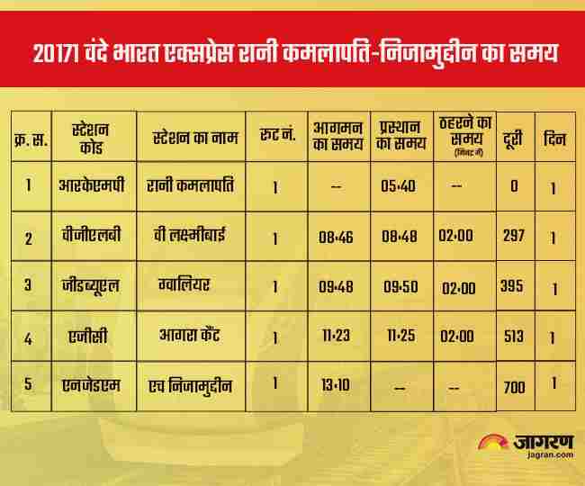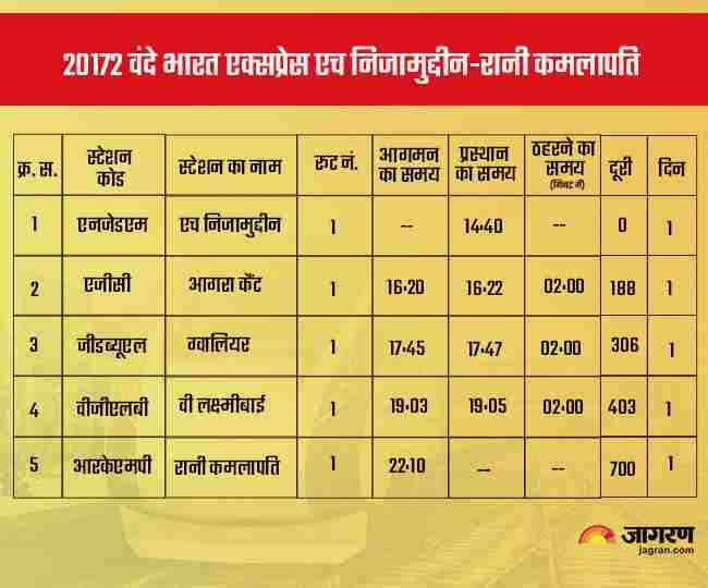 भोपाल के रानी कमलापति स्टेशन से 1 अप्रैल को प्रधानमंत्री नरेंद्र मोदी ने वंदे भारत एक्सप्रेस को हरी झंडी दिखाकर रवाना किया था। एक बार नियमित हो जाने के बाद यह ट्रेन भोपाल स्टेशन से सुबह 5 बजकर 55 मिनट पर निकलेगी और 1 बजकर 45 मिनट पर दिल्ली तक का सफर तय करेगी।