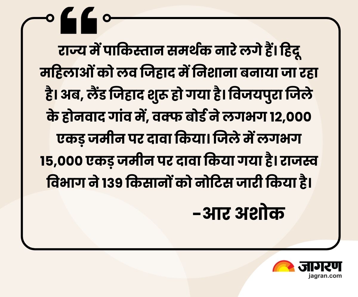 आर अशोक ने कहा, 'जब से कांग्रेस सरकार सत्ता में आई है, प्रतीत होता है कि कर्नाटक में सरकार एक ही समुदाय को लाभ पहुंचा रही है। कांग्रेस की तुष्टीकरण की राजनीति के कारण हिंदुओं को विभिन्न चुनौतियों का सामना करना पड़ रहा है।' अशोक ने कहा, 'राज्य में पाकिस्तान समर्थक नारे लगे हैं। हिदू महिलाओं को लव जिहाद में निशाना बनाया जा रहा है। अब, लैंड जिहाद शुरू हो गया है। विजयपुरा जिले के होनवाद गांव में, वक्फ बोर्ड ने लगभग 12,000 एकड़ जमीन पर दावा किया। जिले में लगभग 15,000 एकड़ जमीन पर दावा किया गया है। राजस्व विभाग ने 139 किसानों को नोटिस जारी किया है।'