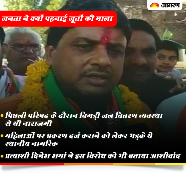 दरअसल, भाजपा के अध्यक्ष प्रत्याशी दिनेश शर्मा रविवार को कार्यकर्ताओं के साथ अलबेला हनुमान मंदिर से भ्रमण पर निकले थे। वे गुलझरा पहुंचे, जहां कुछ लोगों द्वारा उनका फूलों का हार पहनाकर स्वागत किया जा रहा था, तभी एक बुजुर्ग परसराम ने शर्मा को एकाएक जूते-चप्पल से बना हार पहना दिया। इससे सारे कार्यकर्ता आश्चर्यचकित रह गए। साथ चल रहे कार्यकर्ताओं ने बाद में जूते-चप्पल के हार को शर्मा के गले से उतारा।