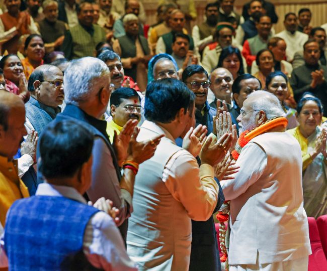 मध्य प्रदेश, राजस्थान और छत्तीसगढ़ की जीत के बाद पहली बार हुए संसदीय बैठक में प्रधानमंत्री मोदी का जोरदार स्वागत हुआ, लेकिन उन्होंने साफ कर दिया कि जीत का श्रेय किसी एक नेता को नहीं, बल्कि पार्टी के सभी कार्यकर्ताओं को जाता है। उन्होंने खुद को भी एक साधारण कार्यकर्ता बताया और सांसदों को मोदी जी के बजाय सिर्फ मोदी कहने की सलाह दी। प्रधानमंत्री मोदी ने कहा कि सरकार में रहते हुए कांग्रेस 40 बार चुनाव मैदान में उतरी, लेकिन केवल सात बार (18 फीसद) ही जीत पाई। इसकी तुलना में भाजपा सरकार में रहते हुए चुनाव लड़ी और 22 बार (56 फीसद) दोबारा सरकार बनाने में सफल रही।