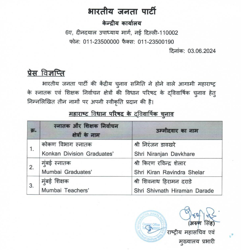 डिजिटल डेस्क, नई दिल्ली। भाजपा ने महाराष्ट्र विधान परिषद द्विवार्षिक चुनावों के लिए उम्मीदवारों के नामों की घोषणा कर दी है। भाजपा ने कोंकण डिवीजन स्नातक, मुंबई स्नातक और मुंबई शिक्षक निर्वाचन क्षेत्रों के लिए उम्मीदवारों के नाम जारी किए हैं।