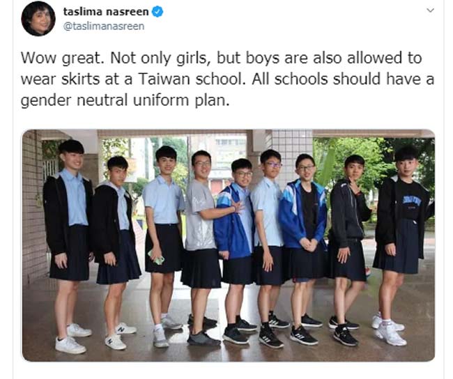 नई दिल्ली, जेएनएन। मशहूर बांग्लादेशी लेखिका तस्लीमा नसरीन ने गुरुवार को ताइवान के स्कूलों में लड़कों को भी स्कर्ट पहनने की इजाजत मिलने पर खुशी जताई। यह जानकारी उन्होंने अपने ट्वीट में दिया। ट्वीट में उन्होंने यह भी लिखा है कि सभी स्कूलों में जेंडर न्यूट्रल यूनिफार्म होना चाहिए।
