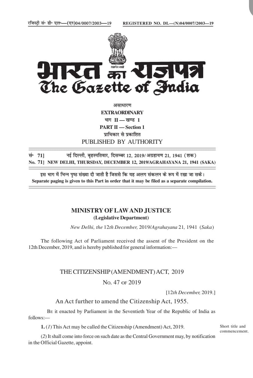 9. गृह मंत्री अमित शाह ने 9 दिसंबर को इसे लोकसभा में पेश किया था। नागरिकता (संशोधन) अधिनियम 2019 (सीएए) संसद में 11 दिसंबर 2019 को पारित किया गया था। सीएए के पक्ष में 125 वोट पड़े थे और 105 वोट इसके खिलाफ गए थे। 12 दिसंबर 2019 को इसे राष्ट्रपति की मंजूरी मिल गई थी।