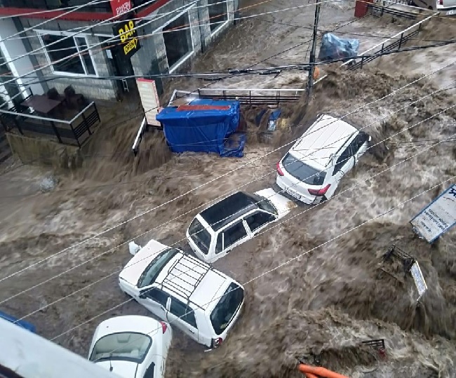 #WATCH | Himachal Pradesh: Heavy rainfall triggered a flash flood in Dharamshala earlier today. Vehicles stuck & submerged in water while people struggle to walk on the road. Visuals from the Bhagsu Nag area. pic.twitter.com/Oz6gAK3xHw