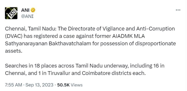 सतर्कता और भ्रष्टाचार निरोधक निदेशालय ने AIADMK के पूर्व विधायक सत्यनारायण बक्तवतचलम के खिलाफ आय से अधिक संपत्ति रखने का मामला दर्ज किया है। पूरे तमिलनाडु में 18 स्थानों पर तलाशी चल रही है जिसमें चेन्नई में 16 और तिरुवल्लुर और कोयंबटूर जिलों में 1-1 जगह शामिल हैं। खबर में अधिक जानकारी की प्रतीक्षा है। खबर अपडेट की जा रही है।