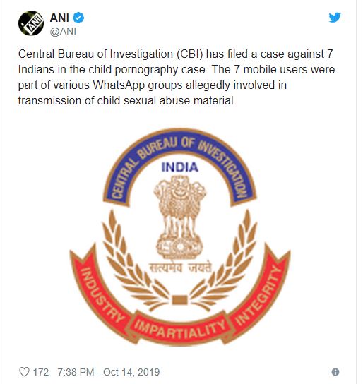 नई दिल्ली, प्रेट्र/एएनआइ। केंद्रीय जांच ब्यूरो (CBI) ने इंटरनेशनल व्हाट्सएप ग्रुप में चाइल्ड पोर्न (बच्चों की अश्लील तस्वीरें) साझा करने के मामले में सात लोगों के खिलाफ केस दर्ज किया है।