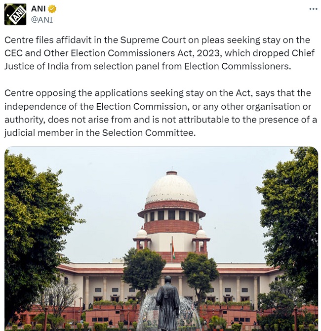 केंद्र ने अधिनियम पर रोक लगाने की मांग करने वाले आवेदनों का विरोध करते हुए कहा है कि चुनाव आयोग या किसी अन्य संगठन या प्राधिकरण की स्वतंत्रता का सवाल ही नहीं उठता और यह चयन समिति में न्यायिक सदस्य की उपस्थिति के कारण नहीं है।