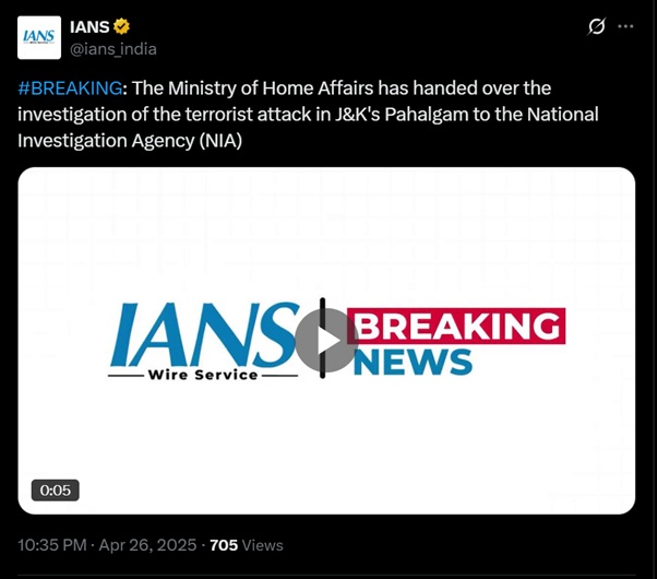 आईएएनएस, नई दिल्ली। जम्मू कश्मीर के पहलगाम में हुए आतंकी हमले की जांच अब केंद्र सरकार ने राष्ट्रीय जांच एजेंसी (एनआईए) को सौंप दी है। हालांकि एनआईए आतंकी हमले के बाद से इस मामले में सक्रिय है।