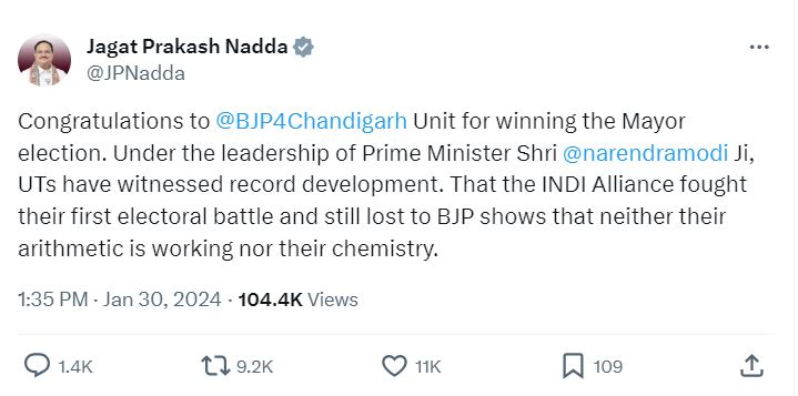 नड्डा ने एक्स पर पोस्ट किया, "मेयर चुनाव जीतने के लिए @भाजपा4चंडीगढ़ इकाई को बधाई। प्रधानमंत्री श्री@नरेंद्र मोदी जी के नेतृत्व में, केंद्र शासित प्रदेशों ने रिकॉर्ड विकास देखा है। भारतीय गठबंधन ने अपनी पहली चुनावी लड़ाई लड़ी और फिर भी भाजपा से हार गया, यह दर्शाता है कि उनका अंकगणित काम नहीं कर रहा है और न ही न ही उनकी केमिस्ट्री।"