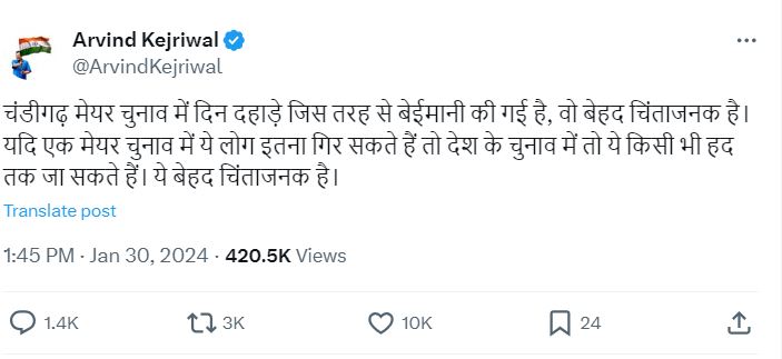केजरीवाल ने एक्स पर पोस्ट किया, "जिस तरह से चंडीगढ़ मेयर चुनाव में दिनदहाड़े बेईमानी की गई है, वह बेहद चिंताजनक है। अगर मेयर के चुनाव में ये लोग इतने नीचे गिर सकते हैं, तो देश के चुनाव में किसी भी हद तक जा सकते हैं। यह बेहद चिंताजनक है।"
