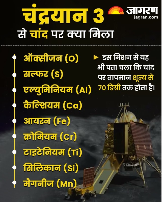 विक्रम लैंडर और प्रज्ञान रोवर की मदद से अब तक इसरो को चांद पर ऑक्सीजन (O), सल्फर (S), एल्युमिनियम (Al), कैल्शियम (Ca), आयरन (Fe), क्रोमियम (Cr), टाइटेनियम (Ti), सिलिकान (Si), मैगनीज (Mn) मिला है। इस मिशन से यह भी पता चला कि चांद पर तापमान शून्य से 70 डिग्री तक होता है, जिसका अनुमान पहले 30 डिग्री तक होने का था।