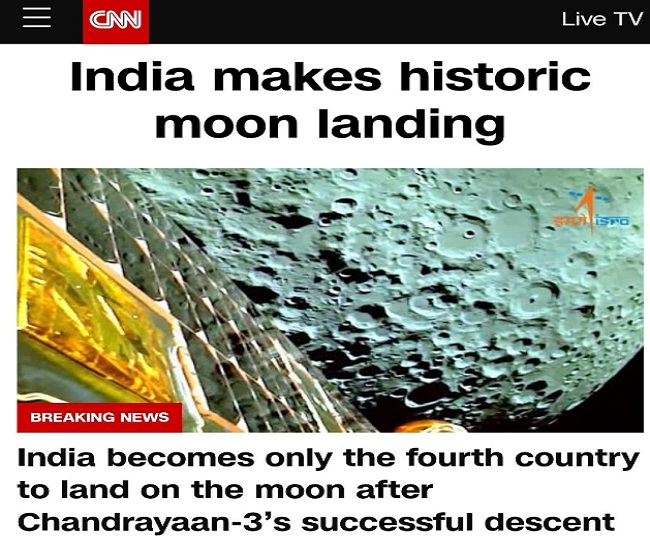 भारत के चंद्रमा मिशन की सफलता ने वैश्विक सुर्खियां बटोरीं शीर्ष समाचार साइटों ने इसरो की ऐतिहासिक उपलब्धि की सराहना की। न्यूयॉर्क टाइम्स द गार्जियन द वाशिंगटन पोस्ट फ्रांस 24 और बीबीसी उन समाचार साइटों में से थे जिन्होंने चंद्रमा के दक्षिणी ध्रुव के पास चंद्रयान -3 की ऐतिहासिक लैंडिंग की सराहना की। सीएनएन ने कहा चंद्रयान-3 की चंद्रमा के दक्षिणी ध्रुव के सबसे करीब है।