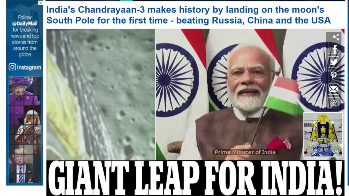 5. डेली मेल ने भी चंद्रयान को लेकर भारत की तारीफ की। अखबार ने कहा कि भारत के चंद्रयान 3 ने चांद के दक्षिणी ध्रुव पर उतरकर इतिहास रच दिया और रूस, चीन और अमेरिका को पीछे छोड़ दिया।