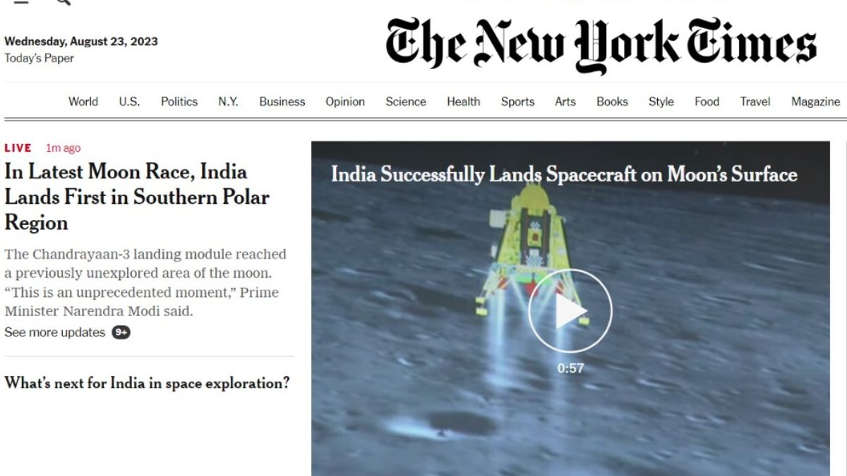 3. न्यूयॉर्क टाइम्स ने अपने कवरेज में कहा, चंद्रयान-3 लैंडिंग मॉड्यूल चंद्रमा के पहले से अज्ञात क्षेत्र में पहुंच गया। प्रधानमंत्री नरेंद्र मोदी ने कहा, "यह एक अभूतपूर्व क्षण है।"