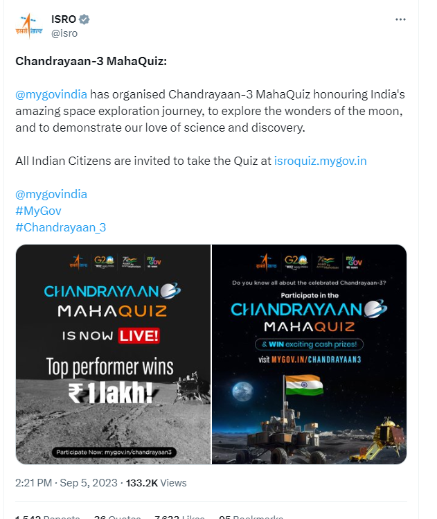 भारतीय अंतरिक्ष अनुसंधान संगठन (ISRO) और MyGov India ने चंद्रयान-3 महाक्विज को लेकर X (पूर्व में ट्विटर) पर जानकारी साझा की है। सभी भारतीय नागरिक https://isroquiz.mygov.in लिंक पर जाकर चंद्रयान-3 महाक्विज में भाग ले सकते है। बता दें कि चंद्रयान-3 महाक्विज लाइव हो चुका है और अब आप भी इसमें पार्टिसिपेट कर अपने जीके (General Knowledge) को टेस्ट कर सकते है।