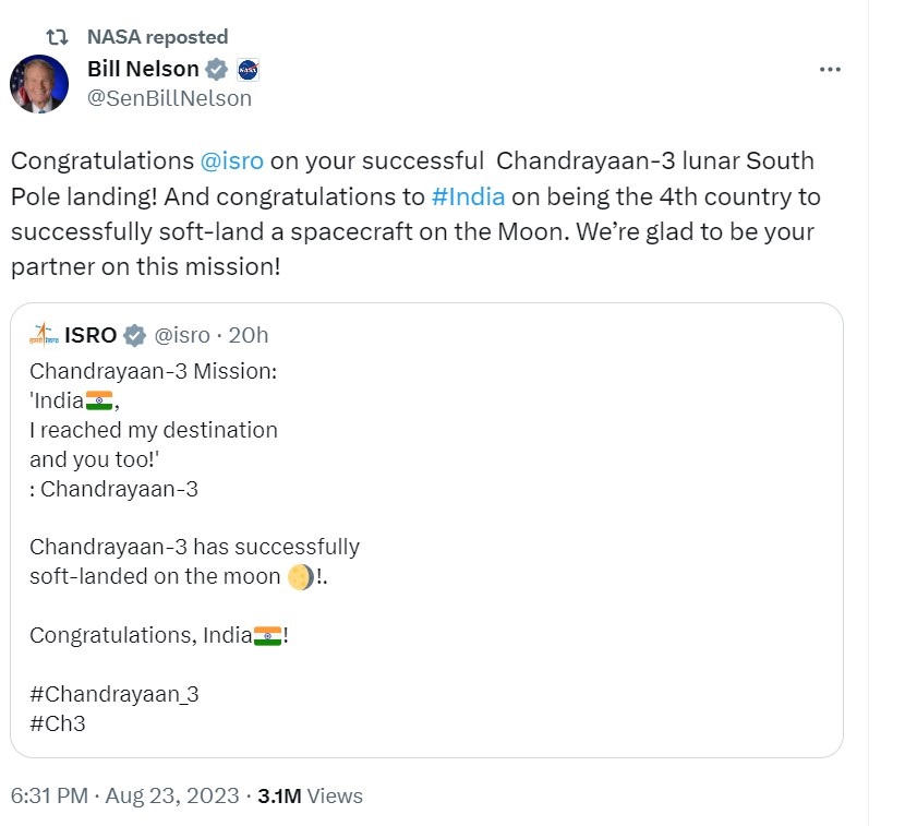 नासा के प्रशासक बिल निलसन ने लिखा,"चंद्रयान-3 के चंद्र दक्षिणी ध्रुव लैंडिंग करने पर इसरो के बधाई। चंद्रमा पर अंतरिक्ष यान की सफलतापूर्वक सॉफ्ट-लैंडिंग करने वाला भारत चौथा देश बन गया है। हमें इस मिशन में आपका भागीदार बनकर हमें खुशी हो रही है!