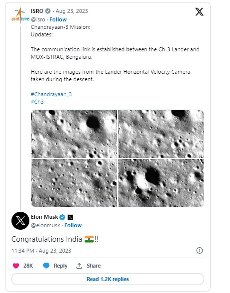 चांद के दक्षिणी ध्रुव पर विक्रम लैंडर की सॉफ्ट लैंडिंग के बाद दुनिया के हर कोने से इसरो और भारत को बधाई मिल रही है। नासा से लेकर स्पेसएक्स के सीईओ एलन मस्क तक ने इसरो और भारत को बधाई देने में देरी नहीं की।