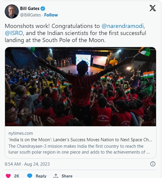 माइक्रोसॉफ्ट के सह-संस्थापक बिल गेस्ट्स ने इस मौके पर लिखा,"मून शॉट्स वर्क! चांद के दक्षिणी प्रधानमंत्री नरेंद्र मोदी, इसरो और भारत के वैज्ञानिकों को बधाई।