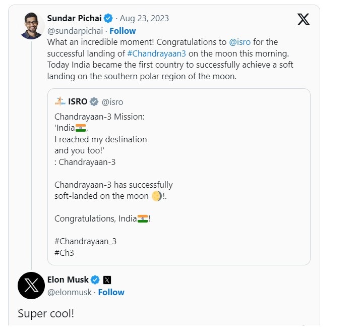 गूगल और अलफाबेट के सीईओ सुंदर पिचाई ने लिखा,"क्या अविश्वसनीय क्षण है!आज सुबह चंद्रमा पर Chandrayaan3 की सफल लैंडिंग के लिए बधाई हो इसरो। आज भारत चंद्रमा के दक्षिणी ध्रुवीय क्षेत्र पर सफलतापूर्वक सॉफ्ट लैंडिंग करने वाला पहला देश बन गया।"