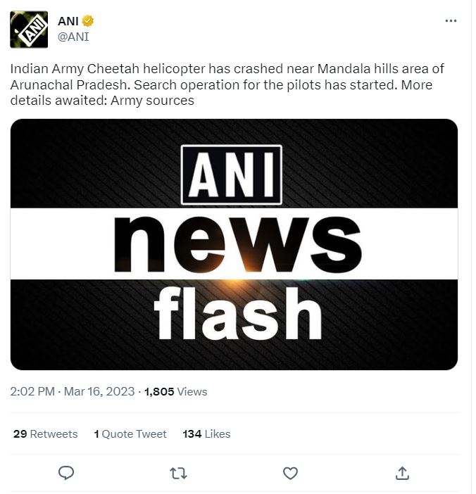 इससे पहले, पीआरओ डिफेंस गुवाहाटी के लेफ्टिनेंट कर्नल महेंद्र रावत ने जानकारी देते हुए बताया था कि अरुणाचल प्रदेश के बोमडिला के पास एक ऑपरेशन सॉर्टी के दौरान आर्मी एविएशन चीता हेलीकॉप्टर का आज सुबह करीब 09.15 बजे एटीसी से संपर्क टूटने की सूचना मिली थी। बोमडिला के पश्चिम में मंडला के पास दुर्घटनाग्रस्त होने की खबर है। खोज दलों को मौके पर भेज दिया गया है।