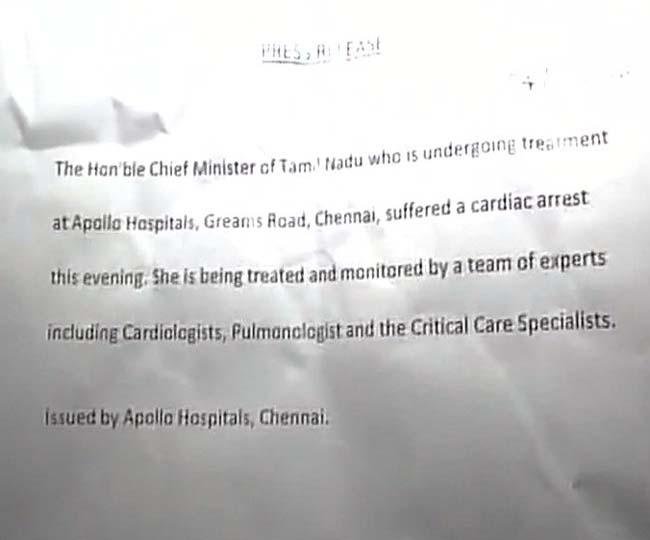 अपोलो अस्पताल ने एक बयान जारी कर बताया "राज्य की सीएम जयललिता को दिल का दौरा पड़ा है। डॉक्टरों की एक टीम उनका इलाज कर रही है।"
