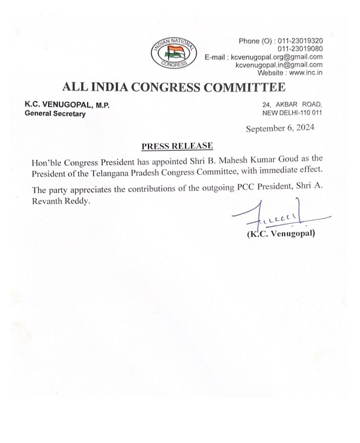 कांग्रेस ने बी महेश कुमार गौड़ को तेलंगाना प्रदेश कांग्रेस कमेटी का अध्यक्ष नियुक्त किया है।एआईसीसी महासचिव (संगठन) केसी वेणुगोपाल की तरफ से जारी एक बयान में कहा गया कि कांग्रेस अध्यक्ष मल्लिकार्जुन खरगे ने गौड़ को तत्काल प्रभाव से तेलंगाना प्रदेश कांग्रेस कमेटी का अध्यक्ष नियुक्त किया। पार्टी निवर्तमान पीसीसी अध्यक्ष ए रेवंत रेड्डी के योगदान की सराहना करती है।