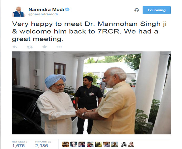 उल्लेखनीय है कि बुधवार की सुबह मनमोहन सिंह ने मोदी सरकार की आर्थिक नीतियों पर करारा प्रहार किया था। इसके साथ्ा ही उन पर लग रहे व्यक्तिगत आरोपों का उन्होंने खंडन किया था। इसके बाद शाम को वे 7 आरसीआर पहुंच गए और पीएम मोदी से मुलाकात की।