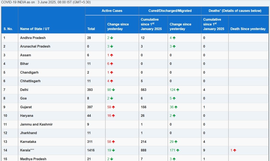 स्वास्थ्य मंत्रालय के अनुसार, वर्तमान में कोरोना के कुल 4026 एक्टिव केस हैं। इनमें सबसे ज्यादा मामले केरल (1416) में देखने को मिल रहे हैं। इसके अलावा दूसरे नंबर पर महाराष्ट्र (494) और तीसरे नंबर पर गुजरात (397) में कोरोना के एक्टिव केस मौजूद हैं। वहीं 393 एक्टिव मामलों के साथ देश की राजधानी दिल्ली चौथे नंबर पर है।
