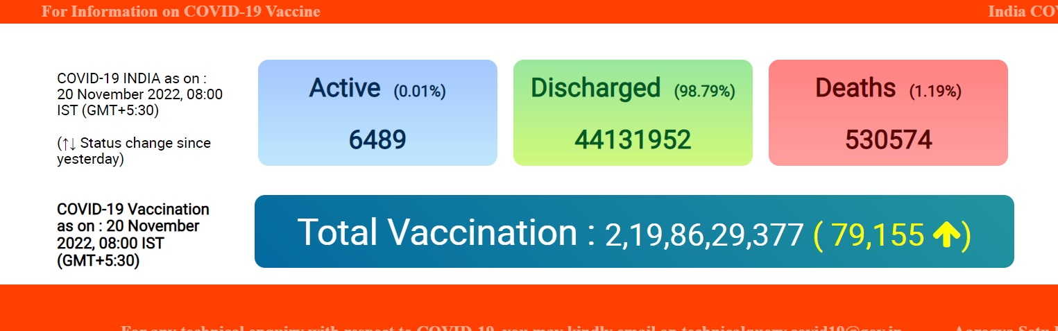 केंद्रीय स्वास्थ्य मंत्रालय जारी किए गए आंकड़ों के अनुसार, देश में कोरोना वायरस के एक्टिव केस घटकर 6,489 रह गए है, जो कुल मामलों का 0.01 प्रतिशत है। मरीजों के ठीक होने की राष्ट्रीय दर 98.79 प्रतिशत है। पिछले 24 घंटों में उपराधीन मरीजों की संख्या में 293 मामलों की कमी आई है। राष्ट्रव्यापी टीकाकरण अभियान के तहत देश में अब तक कोविड-19 रोधी टीकों की 219.86 करोड़ खुराक दी जा चुकी हैं।