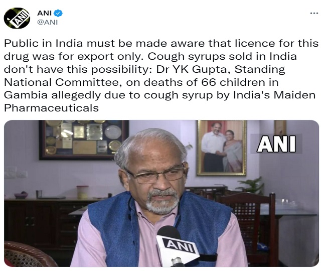 भारत की मेडेन फार्मास्यूटिकल्स द्वारा गाम्बिया में कथित तौर पर कफ सिरप से 66 बच्चों की मृत्यु पर स्टैंडिंग नेशनल कमेटी के उपाध्यक्ष डॉ वाईके गुप्ता ने कहा कि WHO को पहली मृत्यु के बाद हमें अवगत कराया जाना चाहिए था, हो सकता है उन्हें इसकी जांच में समय लगा हो।