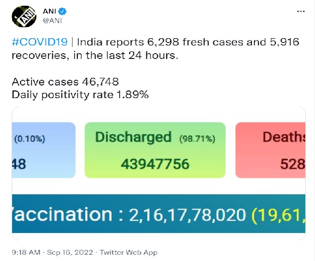 मंत्रालय की रिपोर्ट के मुताबिक, बीते 24 घंटे में कोविड 19 से 5,916 लोग ठीक भी हुए हैं। कोरोना के सक्रिय मरीज बढ़कर अब 46,748 हो गए हैं। इनकी संख्या में 359 का इजाफा हुआ है।