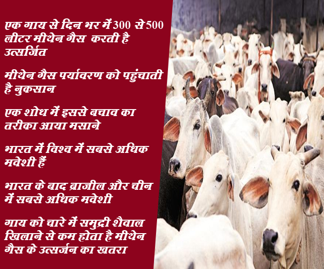 मवेशियों की संख्या के आधार पर भारत दुनिया में शीर्ष पर है। यहां करीब 31 करोड़ मवेशी हैं। 23.3 करोड़ और 9.7 करोड़ मवेशियों के साथ ब्राजील और चीन क्रमश: दूसरे और तीसरे स्थान पर हैं। अगर दुनिया के सभी देश अपने-अपने यहां जानवरों को इस चारे को देना शुरू कर दें तो मीथेन उत्सर्जन काफी कम किया जा सकता है। अकेला भारत साल भर में जितना ग्रीन हाउस गैसों का उत्सर्जन करता है उनमें उसके मवेशियों से होने वाले उत्सर्जन की हिस्सेदारी आठवां हिस्सा है।