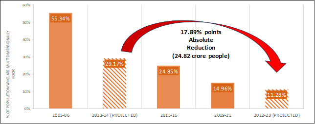 नीति आयोग की रिपोर्ट के मुताबिक वित्त वर्ष 2013-14 में देश की 29.17 प्रतिशत आबादी एमपीआई के हिसाब से गरीब थे। वित्त वर्ष 2022-23 में सिर्फ 11. 28 प्रतिशत लोग एमपीआई के हिसाब से गरीब रह गए हैं। यानी कि इन नौ सालों में 17.89 प्रतिशत लोग गरीबी से बाहर आए। नीति आयोग ने देश की आबादी को 138 करोड़ मानकर एमपीआई तैयार किया है।