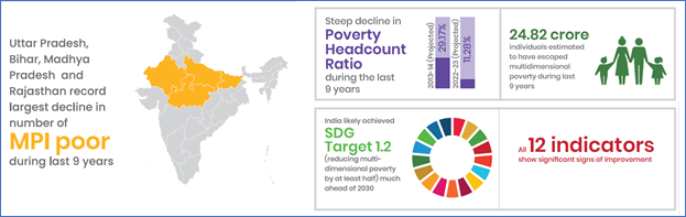 नीति आयोग के दस्तावेज के मुताबिक सरकार की तरफ से चलाए जाने वाले पोषण अभियान व एनीमिया मुक्त भारत अभियान से स्वास्थ्य सुविधा को बढ़ाने में मदद मिली। प्रधानमंत्री गरीब कल्याण अन्न योजना, स्वच्छ ईंधन के लिए उज्ज्वला योजना, सभी घरों में बिजली के लिए सौभाग्य योजना, पेयजल सुविधा के लिए जल जीवन मिशन व जन-धन खाते की सुविधा जैसी योजनाओं से 25 करोड़ लोगों को गरीबी से ऊपर लाने में खासी मदद मिली।