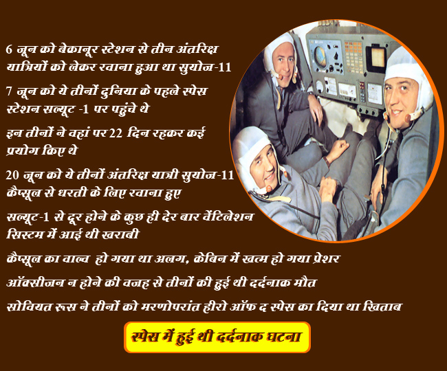 29-30 जून 1971 को अंतरिक्ष और पृथ्वी पर जो कुछ हुआ वो बेहद दर्दनाक था। दुनिया के पहले स्पेस स्टेशन से लौटते हुए तीन अंतरिक्ष यात्री मौत के आगोश में जा चुके थे।